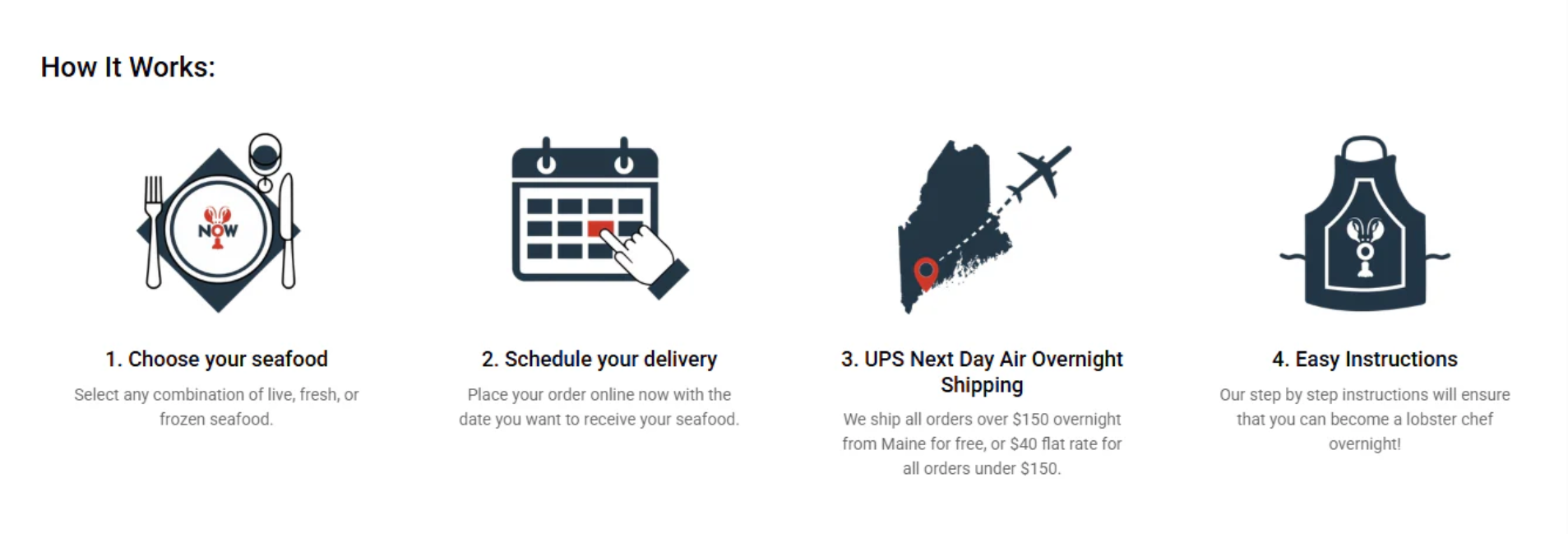 We offer a simple way to buy lobsters. Just select the number of lobsters you want, and we do the rest. Buy lobster anytime, day or night. We deliver lobsters exclusively for a variety of restaurants in southern Maine.